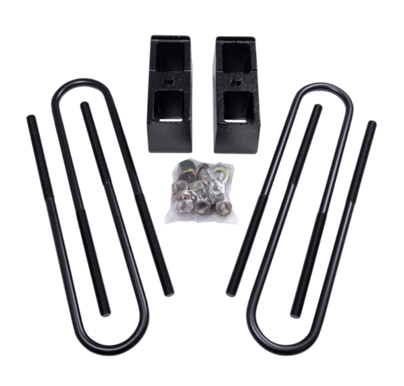 ReadyLIFT OEM-style rear block kits are available for model-specific applications. These Rear Block Kits include two (2) Rear Blocks, four (4) E-Coated U-Bolts, and eight (8) Nuts and Washers. The 3" rear block kit will safely lift the rear an additional 2" after removing the factory 1" block. Based on OEM designs and never made out of lightweight extrusions, ReadyLIFT GM Blocks are made from cast iron and have built-in anti-rotation ears. Fits 2025 new body style 6-lug model GM trucks. New models with OEM 1.25" blocks will want to take advantage of the additional 3" of lift for towing and hauling, particularly when using a front leveling kit. Eliminates the dangers of having stacked blocks which may be illegal in some states. ReadyLIFT Block Kits will put a slight rake back in your truck for hauling or towing and are designed to work in concert with your ReadyLIFT Suspension Leveling Kit. Like all ReadyLIFT products, these block kits come with our Lifetime Warranty.NOTE: This GM 1500 kit is NOT COMPATIBLE with vehicles equipped with rear composite mono-leaf springs. The mono-leaf is easily identifiable, the U-bolt is round/circular around the top of the leaf spring. This kit only works with a vehicle equipped with traditional steel leaf springs identified by square U-bolts.
