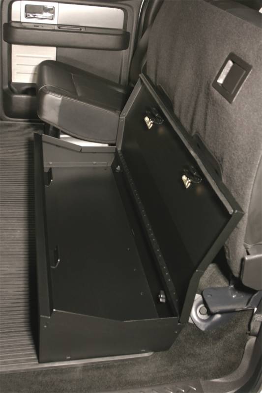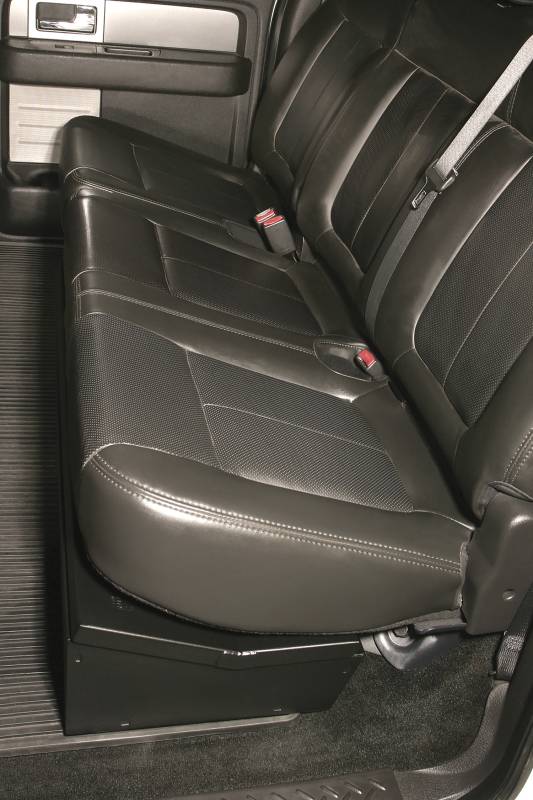 Lockbox | Underseat Full | Ford F-150 | Crew Cab | Standard Key | 2009-2014 This high security welded steel lockbox mounts under the rear seat (Driver side) in your 2009-2014 Ford F-150 Crew Cab with the subwoofer. The formfitting design of the Tuffy lockbox has over 2740 cubic inches of lockable storage. Its secured contents are easily accessed by flipping the rear seat up. The innovative mounting system only accessed from inside the box when unlocked allows the entire lockbox to be removed in seconds, without the need for any tools, when extra floor space is needed or to store the lockbox and locked contents in an alternate location. Featuring Tuffy's Pry-Guard Locking System with a 10 tumbler double bitted security lock with built in weather seals. Mounts inconspicuously under the seat out of apparent site of opportunistic thieves. Is quickly and easily installed using the factory hardware without drilling.