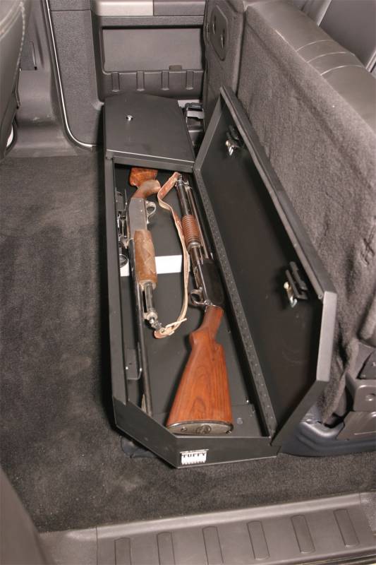 Lockbox | Underseat Full | | Standard Key | Ford Super Duty Super Crew | 2003-20 This high security welded steel security lockbox mounts under the rear seat in your 2003-2016 Ford F-250/F-350/F-450 Super Duty Crew Cab. The full width formfitting design of the Tuffy lockbox has over 2170 cubic inches of lockable storage. Its secured contents are easily accessed by flipping either or both rear seat(s) up and opening the corresponding lid(s). The unique design allows the full width to be used to stow firearms or other long items. Featuring Tuffy's Pry-Guard Locking System with a 10 tumbler double bitted security lock with built in weather seals. Chamfered corners are incorporated into the design for easier passenger access. The innovative mounting system is only accessed from inside the box. Mounts inconspicuously under the seat out of apparent site of opportunistic thieves.