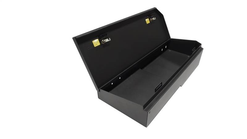 Lockbox | Underseat Full | Chevy/GMC Crew Cab 60% Bench | Standard Key | 2007-20 This high security welded steel security lockbox mounts under the rear 60 percent bench seat in your 2007-2018 Chevrolet/GMC 1500 or 2007-2019 Chevrolet/GMC 2500 HD/3500 HD Crew Cab truck. The three-fifths width formfitting design of the Tuffy lockbox has over 2100 cubic inches of lockable storage while leaving room for an aftermarket sub-woofer or other gear under the rear passenger side seat. Its secured contents are easily accessed by flipping the 60 percent rear bench seat up and lifting the lid. The unique design allows the space beneath the 60 percent bench seat to be used to stow firearms or other long items securely. This lock box comes standard with Tuffy's Pry-Guard Locking System and a 10 tumbler double bitted security lock with built in weather seals. Chamfered corners are incorporated into the design for easier passenger access and a more concealed form factor. The innovative mounting system is accessed from inside the box.
