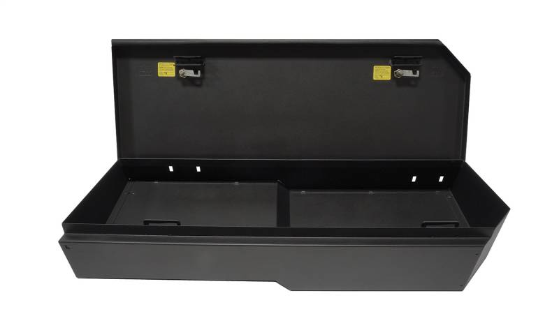 Lockbox | Underseat Full | Chevy/GMC Crew Cab 60% Bench | Standard Key | 2007-20 This high security welded steel security lockbox mounts under the rear 60 percent bench seat in your 2007-2018 Chevrolet/GMC 1500 or 2007-2019 Chevrolet/GMC 2500 HD/3500 HD Crew Cab truck. The three-fifths width formfitting design of the Tuffy lockbox has over 2100 cubic inches of lockable storage while leaving room for an aftermarket sub-woofer or other gear under the rear passenger side seat. Its secured contents are easily accessed by flipping the 60 percent rear bench seat up and lifting the lid. The unique design allows the space beneath the 60 percent bench seat to be used to stow firearms or other long items securely. This lock box comes standard with Tuffy's Pry-Guard Locking System and a 10 tumbler double bitted security lock with built in weather seals. Chamfered corners are incorporated into the design for easier passenger access and a more concealed form factor. The innovative mounting system is accessed from inside the box.