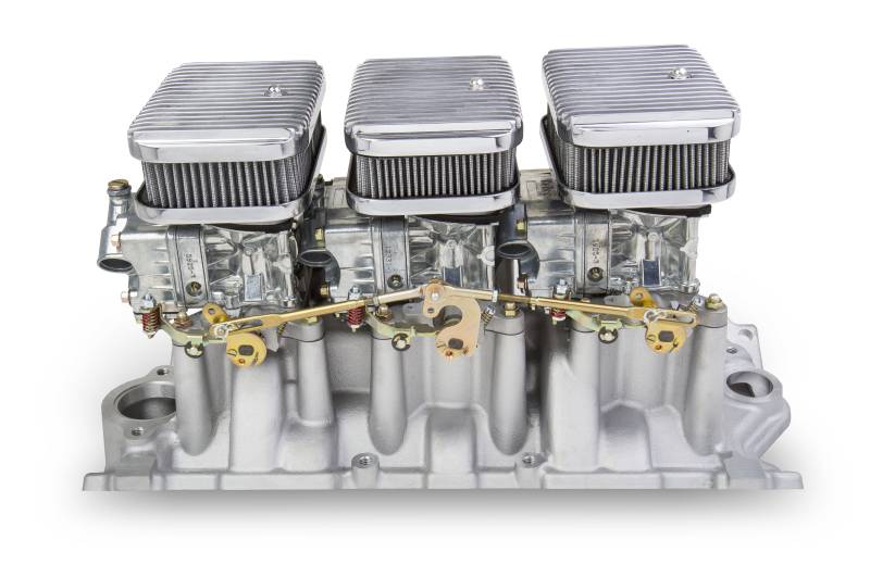 The world famous Holley Tri-Power Carburetor system is legendary in Chevrolet circles! They were the ultimate power statement when they came factory on cars like the 1967 427 Corvette.\nAnd, NOW you can have the same look on your SB Chevy! Perfect for muscle cars, street rods, classic hot rods, rat rods, trucks and more!\nECONOMY AND BIG HORSEPOWER!\nCruise around economically on the 325 CFM center carb, and when you decide to step on it, the two 350 CFM outboard carbs kick in for head-snapping performance!\nSystems Include:\n• Weiand Dual plane medium rise 3x2 intake manifold\n• (3) Holley 2-bbl carbs (two 350 CFM outboard carbs, one 325 CFM center carb w/ electric choke)\n• High-quality steel fuel lines\n• Progressive throttle linkage\n• Reusable air filters with polished housings\n• Carburetors available in Dichromate or Shiny Finish