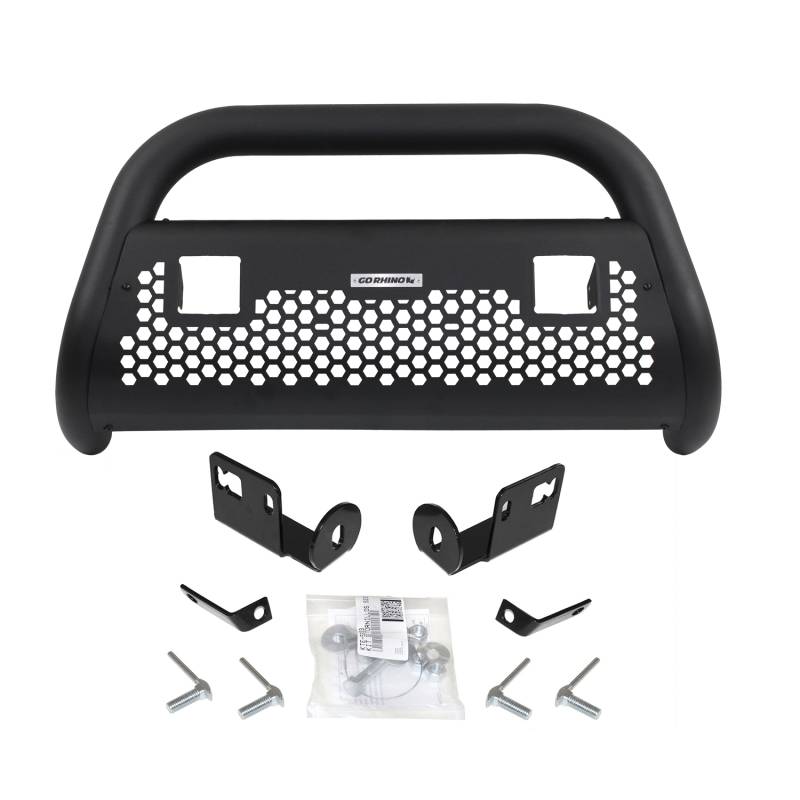 RC2 LR Bull Bar with Mounting Brackets and Two 3" Cube Lights Kit Go Rhino's RC2 LR Bull Bars offer updated styling and the ability to combine today’s popular LED lights with front-end protection. The 3" diameter tubular steel frame features a galvanized steel skid plate with a stylish hexagonal cut out pattern. Different styles are available with light mounts for one 20" single row light bar, two 3" cube lights or four 3" cube lights. In addition, all RC2 LR Bull Bars have pre-drilled light mount holes across the center crossmember. The RC2 LR is available as a standalone; as a kit that includes vehicle-specific mounting brackets; or as a kit that includes both mounting brackets and LED lights. Installation is easy with no drilling required. RC2 LR Bull Bars come with a Limited Lifetime warranty on materials and construction, a 5 year warranty on the Textured Black Finish and a 1 year warranty on the electrical compoenents. 3" diameter tubular steel and hexagonal skid plate Complete kit includes bull bar frame, mounting brackets and cube lights Easy bolt-on, no-drill installation Not compatible with ParkSense, Rebel, Sport, Express and TRX Models Limited Lifetime warranty on materials and construction, a 5 year warranty on the Textured Black finish and a 1 year warranty on the electrical compoenents.