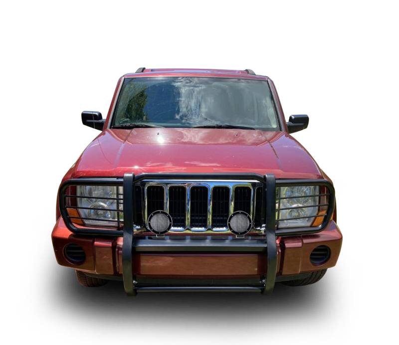 Grille Guard Kit Black Horse Off Road Grille Guard Kit Black Steel Modular Pair of 5.3" Dia. LED Flood Lights w/ Black Trim Rings Wiring Harness and Switch It May Interfere with Vehicles equipped with Emergency Braking Systems, Adaptive Cruise Control and Parking Sensors Black Horse Off-Road Modular Design Black Powder Coat Grille Guard Kit 17A081000MA-PLFB Compatible with 2006-2010 Jeep Commander No-Drill/ Vehicle-Specific Application for Custom Fit'solid frame-mounted bolt-on, no drill installation / Welded 3-piece bolt-together construction ?" thick HRPO vertical steel plates