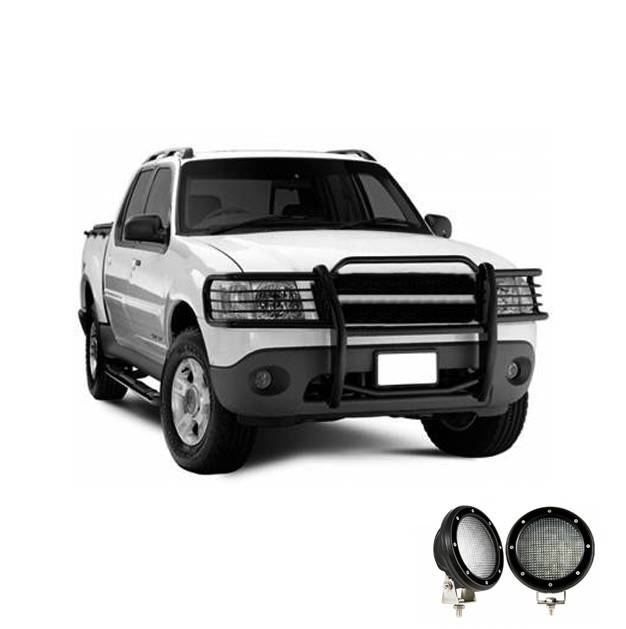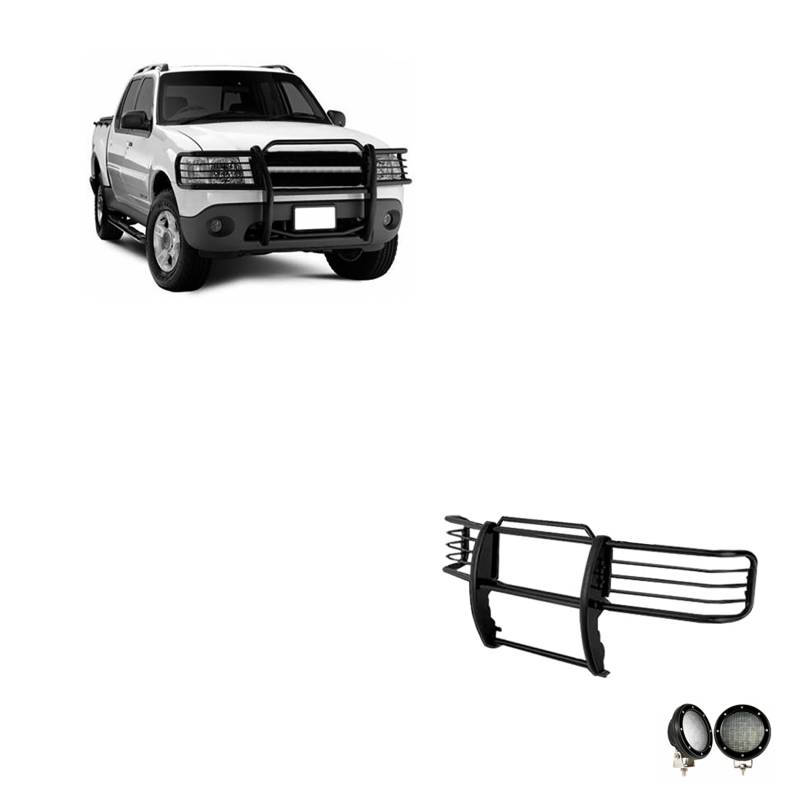 Grille Guard Kit Black Horse Off Road Grille Guard Kit Black Steel Modular Pair of 5.3" Dia. LED Flood Lights w/ Black Trim Rings Wiring Harness and Switch Black Horse Off-Road Modular Design Black Powder Coat Grille Guard Kit 17FJ24MA-PLFB Compatible with 2001-2003 Ford Explorer Sport 2001-2005 Ford Explorer Sport Trac No-Drill/ Vehicle-Specific Application for Custom Fit'solid frame-mounted bolt-on, no drill installation / Welded 3-piece bolt-together construction ?" thick HRPO vertical steel plates