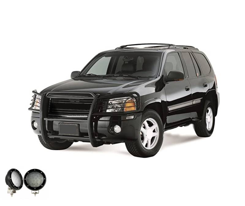 Grille Guard Kit Black Horse Off Road Grille Guard Kit Black Steel Modular Pair of 5.3" Dia. LED Flood Lights w/ Black Trim Rings Wiring Harness and Switch Excl. Denali Black Horse Off-Road Modular Design Black Powder Coat Grille Guard Kit 17GD26MA-PLFB Compatible with 2002-2006 GMC Envoy 2002-2006 GMC Envoy XL No-Drill/ Vehicle-Specific Application for Custom Fit'solid frame-mounted bolt-on, no drill installation / Welded 3-piece bolt-together construction ?" thick HRPO vertical steel plates