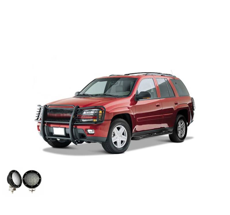 Grille Guard Kit Black Horse Off Road Grille Guard Kit Black Steel Modular Pair of 5.3" Dia. LED Flood Lights w/ Black Trim Rings Wiring Harness and Switch It May Interfere with Vehicles equipped with Emergency Braking Systems, Adaptive Cruise Control and Parking Sensors Black Horse Off-Road Modular Design Black Powder Coat Grille Guard Kit 17GK26MA-PLFB Compatible with 2002-2009 Chevrolet Trailblazer 2002-2006 Chevrolet Trailblazer EXT No-Drill/ Vehicle-Specific Application for Custom Fit'solid frame-mounted bolt-on, no drill installation / Welded 3-piece bolt-together construction ?" thick HRPO vertical steel plates