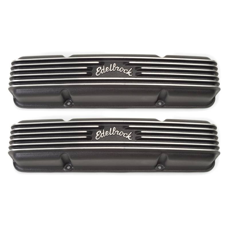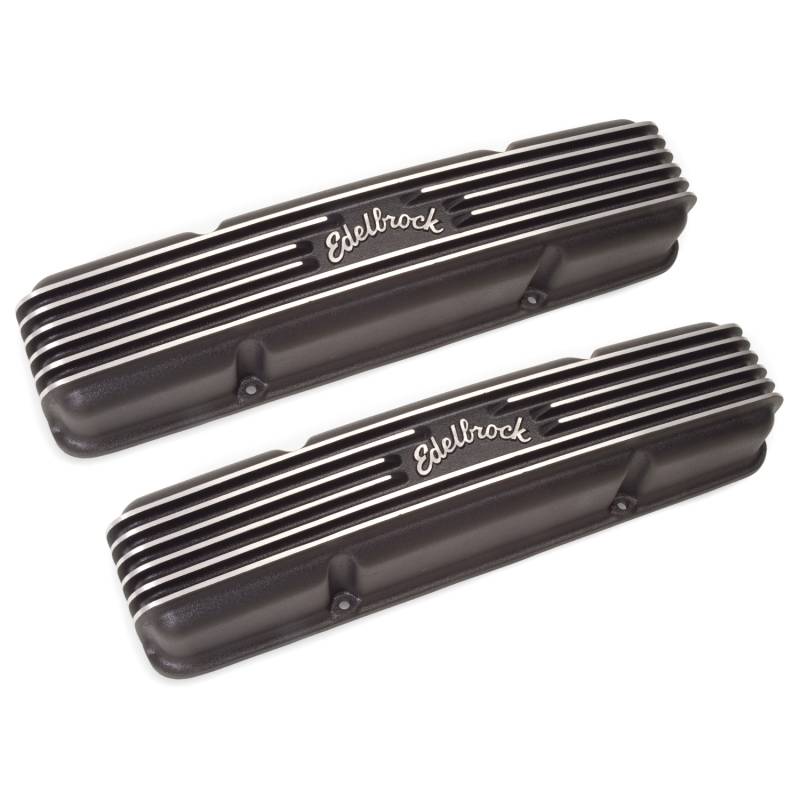 Edelbrock part #41453 Classic Series Valve Covers are designed for Chevy 262-400 V8 1959-86 (No breather holes) applications with a black powder coat finish. Edelbrock first made these aluminum valve covers in the late '50s and they're still a classic. Made of heavy-gauge sand-cast aluminum, Overall height is measured from base to top at the highest point. Edelbrock classic valve covers can be machined to accept breathers if desired.