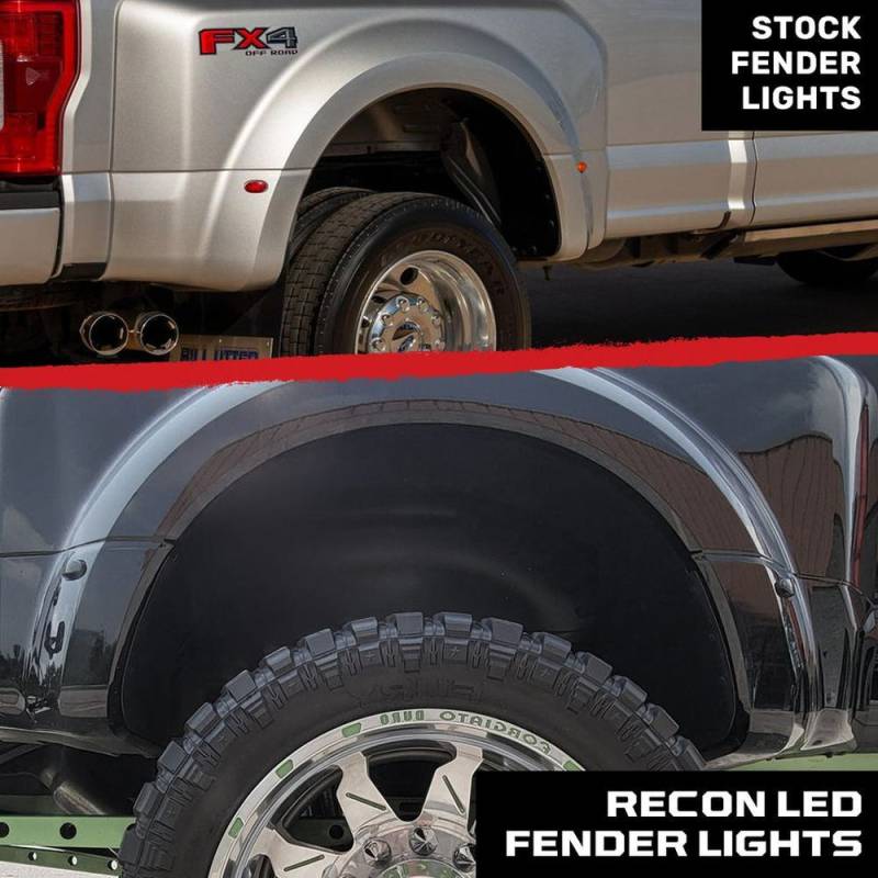 - With amber, red, and white LED fender lights, with either a clear/chrome or black/smoked lens, select the RECON part that finishes off the look of your truck. You're building a masterpiece. A truck with aftermarket accessories that is sure to turn heads, draw attention at the local truck meet ups, and perform both on and off the road. You select only the best parts, and put your time and sweat into installation because you want a truck unlike any other. We get it. At RECON, we're truck lovers too and we share that same goal.