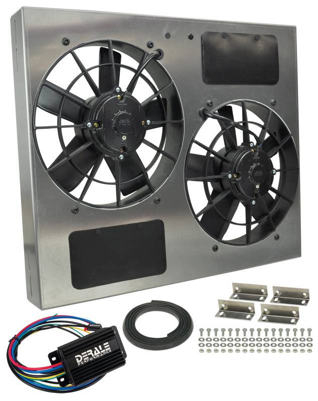 Powerpack - High Output Dual 11" RAD Fan/Alum Shroud Kit w/ PWM Controller Get complete control of your engine temperature! Derale Performance has combined their high performing shrouded Powerpacks with the ultimate fan controller. Using high output electric fans incorporated into an engineered shroud, this Powerpack can conquer even the most difficult cooling conditions. This unit features an aluminum shroud measuring 23 3/4" wide by 19 3/4" top to bottom and is only 4 1/2" in overall depth to offer an adjustable yet precision fit. The natural, non-finished aluminum shroud gives the user the freedom to polish, anodize, paint, or simply leave it raw to create a truly custom look for an affordable price. The Dual IP-68 certified waterproof/dustproof 11" electric fans provide a powerful one-two 3750 cfm punch to a hot engine. This dual electric fan assembly generates the most real-world airflow in the smallest package on the market. Now add the PWM Fan Controller with built-in soft start technology. The controller utilizes Pulse Width Modulation to constantly adjust electric fan speeds from 0-100%, maintaining the optimal engine operating temperature. No more reacting to the engine temps, you can control it! This allows electric fans to operate at the percentage needed, instead of 100% all the time, therefore increasing component life and eliminating amperage spikes. Powerpack - High Output Dual 11" RAD Fan/Alum Shroud Kit w/ PWM Controller