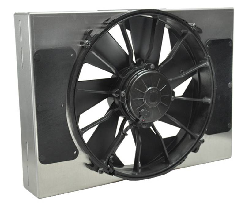 High Output Single 12" Electric RAD Fan/Aluminum Shroud Kit This High Output Single RAD Fan is part of the HO Aluminum Shrouded Fans Series designed with popular applications in mind. This assembly measures 18" wide by 13" top to bottom and only 4" thick overall to offer an adjustable yet precision fit. The raw aluminum shroud gives the user the freedom to polish, anodize, paint, or simply leave it natural to create a truly custom look for an affordable price. Using a 12" high output fan offering 2000 CFM to create the most airflow possible in a compact size. Shroud comes equipped with two air pressure relief vents. High Output Single 12" Electric RAD Fan/Aluminum Shroud Kit