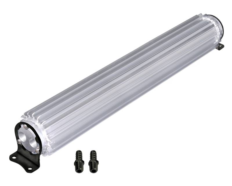2 Pass 18" Heat Sink Fluid Cooler Our compact all aluminum two-pass Heat Sink cooler uses both external and internal fins to maximize heat transfer. With a 3" diameter it can be mounted in a variety of locations and the universal design can be used to cool a wide variety of components. This one is perfect for fuel and power steering applications but can also be used to cool engine oil and transmission fluid in light duty applications. With the inlet and outlet ports on the same end mounting in limited space applications is much easier. Includes hose barbs. 2 Pass 18" Heat Sink Fluid Cooler