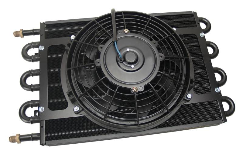 8 Pass 18" Dyno-Cool Remote Cooler, -6AN The Dyno-Cool Universal Remote Cooler can be mounted anywhere space permits, using a highly efficient copper tube/aluminum fin cooler and a curved blade fan to provide airflow and extend transmission life. Perfect for medium duty use. Mounting kit not included. 8 Pass 18" Dyno-Cool Remote Cooler, -6AN