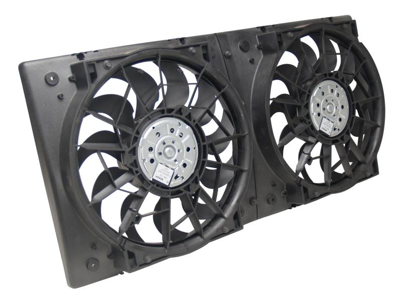 High Output Dual 12" Electric RAD Fan/Plastic Shroud Kit This high performance primary cooling fan kit combines two high output 265 watt Bosch motors with stator flow directors and an OE-quality injection molded fan shroud to produce one serious dual electric fan setup. Designed for puller applications, It's perfect for perfect for muscle cars, street rods and heavy duty trucks, this combination produces 4,000 CFM while each fan draws 24.8 amps. Includes through radiator mounting system and two high amp relay harnesses. High Output Dual 12" Electric RAD Fan/Plastic Shroud Kit