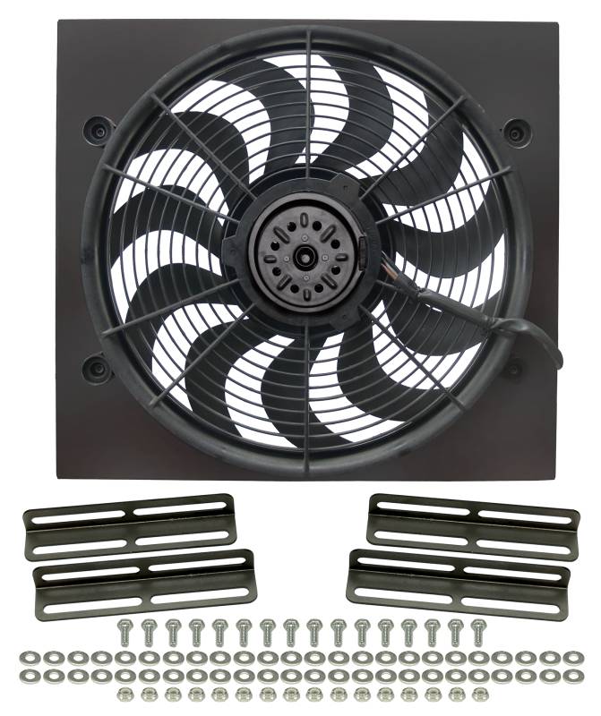 High Output 17" Electric Puller Fan/Black Steel Shroud Kit A primary cooling fan, this universal metal-shrouded single H.O. RAD Powerpack fan features our powerful 17" 2 speed 265-watt motor fan and surrounds it with a 19-1/2" x 18" x 3" black powder-coated shroud that allows fitment in a wide range of hot rods and street rods with narrow radiator applications. A puller fan only, the kit includes 4 black powder-coated mounting brackets and assembly hardware. High Output 17" Electric Puller Fan/Black Steel Shroud Kit