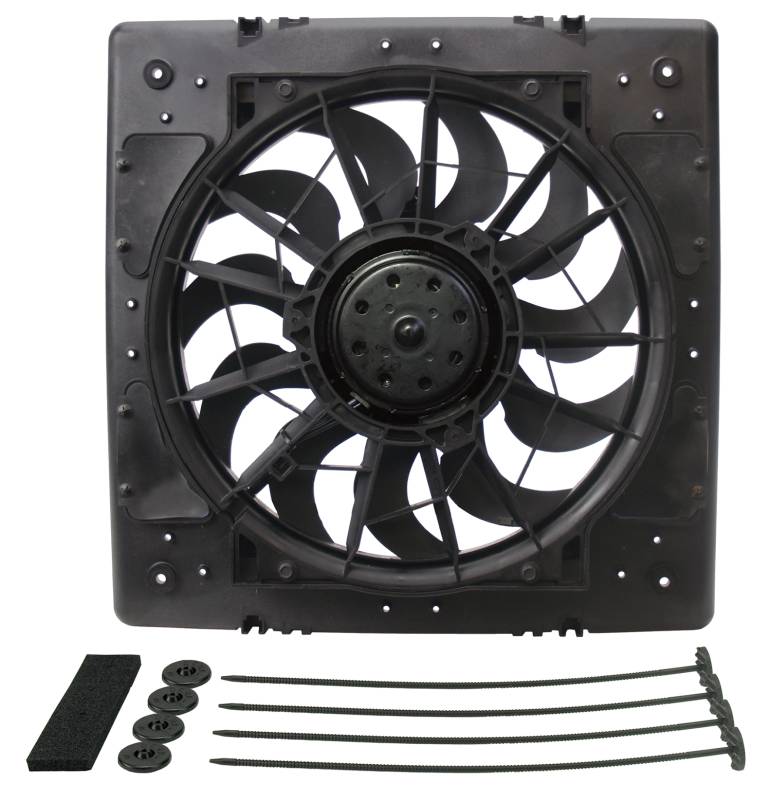 12" High Output Single RAD Puller Fan with Molded Shroud Another popular universal shrouded Single H.O. RAD fan, this puller fan features an injection molded shroud with pressure relief vents, 265 watt Bosch motor spinning 11 quiet, patented skewed blades qualifies it for primary cooling use. Kit includes high amp relay wire harness, 4 plastic, through-radiator core rods and clips and 4 foam mounting pads. 12" High Output Single RAD Puller Fan with Molded Shroud