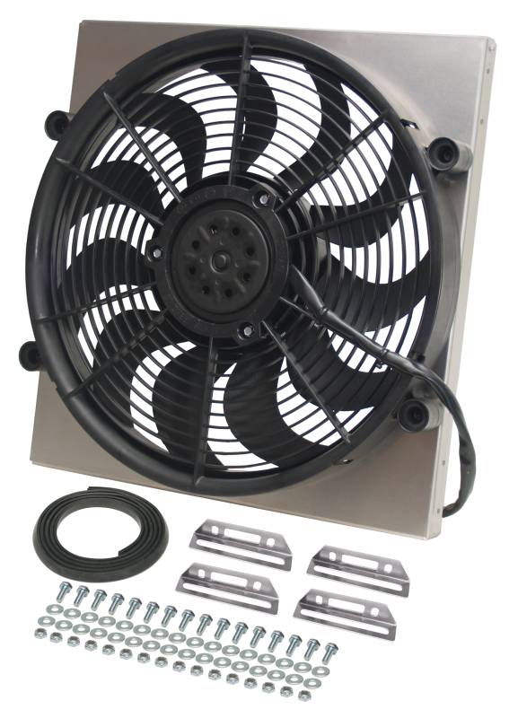 Powerpack - High Output Single 17" Electric RAD Fan/Aluminum Shroud Kit This High Output Single RAD Fan Powerpack is part of the HO Aluminum Shrouded Fan Series designed with popular applications in mind. This assembly measures 16 3/4" wide by 17 5/8" top to bottom and only 3" thick overall to offer an adjustable yet precision fit. The raw aluminum shroud gives the user the freedom to polish, anodize, paint, or simply leave it natural to create a truly custom look for an affordable price. The 17" high output two speed fan is one of the best in our line-up offering 2400 CFM when on high to create the most airflow possible in a compact size. Powerpack - High Output Single 17" Electric RAD Fan/Aluminum Shroud Kit