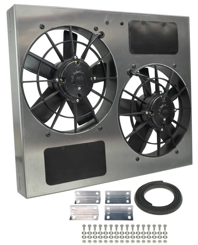 Powerpack - High Output Dual 11" Electric RAD Fan/Aluminum Shroud Kit This Dual High Output RAD Fan Powerpack Assembly allows true Dual Fan performance in a package the size of others Single shrouded fans. Featuring an aluminum shroud measuring a tidy 23 3/4" wide by 19 3/4" top to bottom and only 4 1/2" in overall depth to offer an adjustable yet precision fit, it uses two IP-68 certified waterproof/dustproof 11" electric fans to provide a powerful one-two 3750 cfm punch to a hot engine. The natural, non-finished aluminum shroud gives the user the freedom to polish, anodize, paint, or simply leave it raw to create a truly custom look at a reasonable price. Powerpack - High Output Dual 11" Electric RAD Fan/Aluminum Shroud Kit