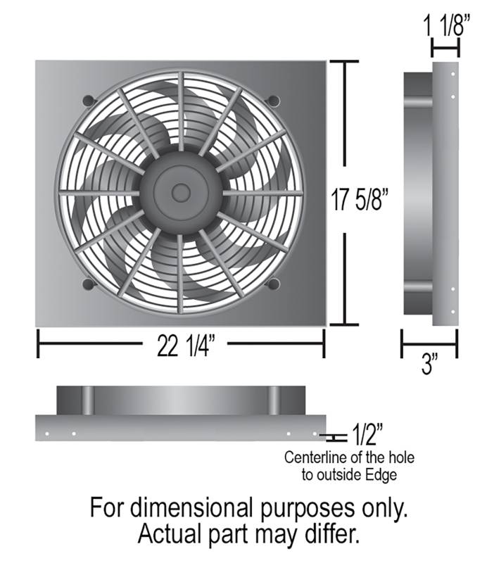 Powerpack - High Output Single 17" Electric RAD Fan/Aluminum Shroud Kit This High Output Single RAD Fan Powerpack is part of the HO Aluminum Shrouded Fan Series designed with popular applications in mind. This assembly measures 22 1/4" wide by 17 5/8" top to bottom and only 3" thick overall to offer an adjustable yet precision fit. The raw aluminum shroud gives the user the freedom to polish, anodize, paint, or simply leave it natural to create a truly custom look for an affordable price. The 17" high output two speed fan is one of the best in our line-up offering 2400 CFM when on high to create the most airflow possible in a compact size. Powerpack - High Output Single 17" Electric RAD Fan/Aluminum Shroud Kit