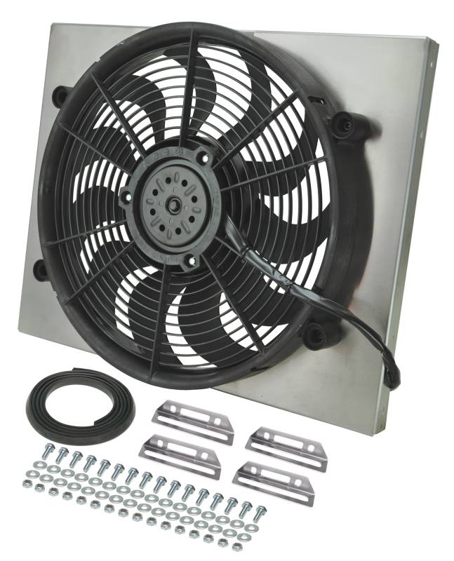 Powerpack - High Output Single 17" Electric RAD Fan/Aluminum Shroud Kit This High Output Single RAD Fan Powerpack is part of the new HO Aluminum Shrouded Fans Series designed with popular applications in mind. This assembly measures 21" wide by 16 3/4" top to bottom and only 3" thick overall to offer a precision fit. The raw aluminum shroud gives the user the freedom to polish, anodize, paint, or simply leave it natural to create a truly custom look for an affordable price. The 17" high output two speed fan is one of the best in our line-up offering 2400 CFM when on high to create the most airflow possible in a compact size. Powerpack - High Output Single 17" Electric RAD Fan/Aluminum Shroud Kit
