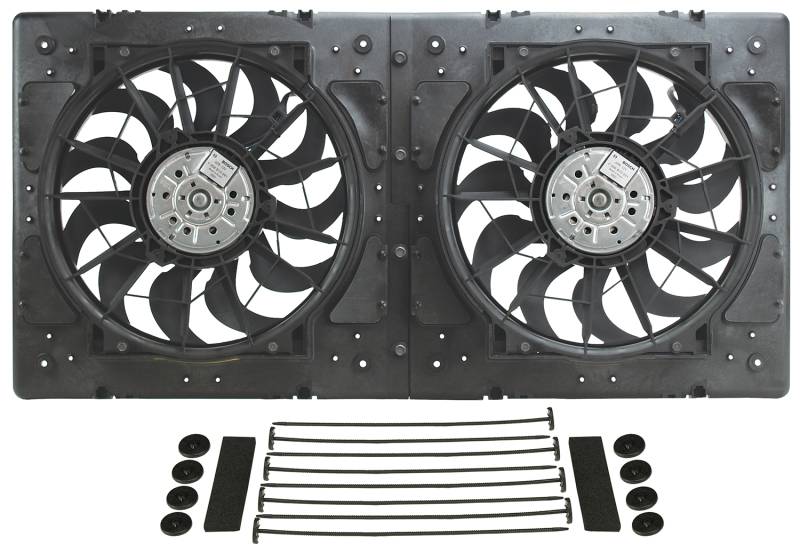 High Output Dual 12" Electric RAD Fan/Plastic Shroud Kit This high performance primary cooling fan kit combines two high output 265 watt Bosch motors with stator flow directors and an OE-quality injection molded fan shroud with pressure relief vents to produce one serious dual electric fan setup. Designed for puller applications, it's perfect for muscle cars, street rods and heavy duty trucks, this combination produces 4,000 CFM while each fan draws 24.8 amps. Includes through radiator mounting system and two high amp relay harnesses. High Output Dual 12" Electric RAD Fan/Plastic Shroud Kit