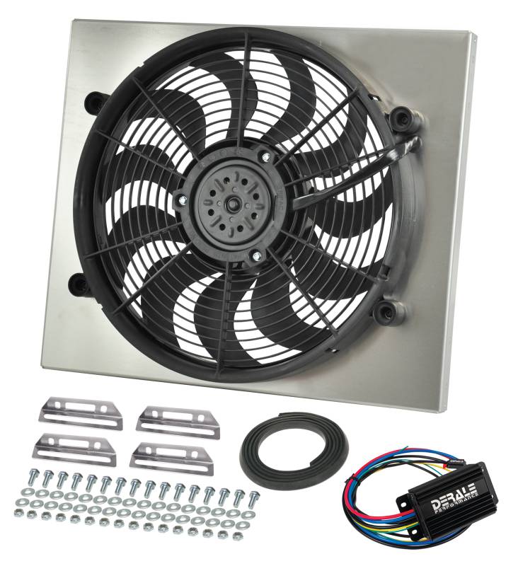 Powerpack - High Output Single 17" RAD Fan/Alum Shroud Kit w/ PWM Controller Get complete control of your engine temperature! Derale Performance has combined their high-performing shrouded Powerpacks with the ultimate fan controller. Using a high output electric fan incorporated into an engineered shroud, this Powerpack can conquer even the most difficult cooling conditions. This unit features a Aluminum shroud measuring 22 1/4" wide by 17 5/8" top to bottom and is only 3" in overall depth to offer a precision fit. This 17" high output two speed fan is one of the best in our line-up offering up to 2400 CFM and is specifically designed to thrive on thick, tight fin radiator cores. Now add the PWM Fan Controller with built-in soft start technology. The controller utilizes Pulse Width Modulation to constantly adjust electric fan speeds from 0-100%, maintaining the optimal engine operating temperature. No more reacting to the engine temps, you can control it! This allows the 17” electric fan to operate at the percentage needed, instead of 100% all the time, therefore increasing component life and eliminating amperage spikes. Powerpack - High Output Single 17" RAD Fan/Alum Shroud Kit w/ PWM Controller