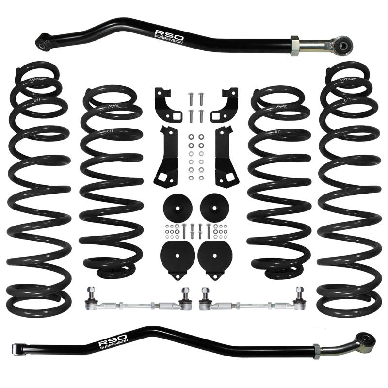 RSO Suspension 2.5 inch Stage 1.0 Lift Kit - 07-18 Jeep Wrangler JK/JKU RSO Suspension’s 2.5 inch Lift Kits for the Wrangler JK/JKU are the ultimate solution for your next adventure. Designed to enhance articulation, stability and performance on and off road while giving you a driving experience like no other. High quality materials and coatings ensure lifelong durability from everyday city driving to steep inclines on the toughest trails. Engineered to replace the weak factory components that limit wheel travel, ground clearance and articulation. Installing a lift lets you add larger tires increasing the ability to go over larger obstacles without damage to the underside of your Wrangler. Each kit's components were specifically chosen to work together to give your ride the best balance of performance and comfort. Multiple kit stages let you choose the level of performance and value you want to experience on your Wrangler and offer the ability to upgrade further down the line. Elevate your off-road experience with our RSO suspension lift kits, the ultimate solution for those seeking adventure and off-road enthusiasts alike. Designed to enhance articulation, stability and performance on and off road. High quality materials and coatings for long life and corrosion free performance on any terrain Replaces weak factory components that limit your wheel travel, articulation and break over angle Installing a lift kit allows the installation of larger tires for better ground clearance to go over taller obstacles without damage to the underside of your Wrangler Specifically chosen and combined parts that complement each other to give your vehicle the best balance of performance and comfort Multiple kit stages let you choose the level of performance you want to experience for the best value