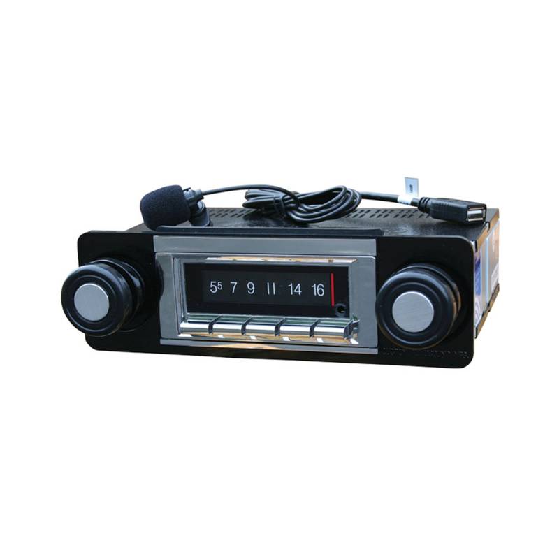 1967-72 Chevrolet Version Shown. This is the top-of-the-line radio featuring an AM/FM digital tuner, built-in mobile wireless connectivity, a USB port, two auxiliary inputs (3.5mm in front, two CH in rear), and the ability to add a single disc CD player. The mobile wireless capability allows you to listen to the radio, stream music from your phone, and talk hands-free without having to cut the dash.