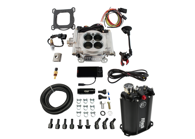 Go EFI 4 600 HP Bright Aluminum EFI System Master Kit The ultimate solution for fuel management and delivery : FiTech's Master EFI Kits. Seamlessly integrating an advanced EFI system with a perfectly paired fuel delivery setup, these master kits redefine performance and reliablity. Experience enhanced horsepower, optimized fuel efficiency, and effortless startups. With FiTech's cutting-edge technology, this all-inclusive package eliminates the guesswork, offering a comprehensive solution for enthusiasts all in one box. Unleash the power of electronic fuel injection while ensuring a seamless and reliable fuel supply. Elevate your driving experience with FiTech Master EFI Kits : where precision meets power in perfect harmony.When it comes to fuel injection versus carburetors, new school is just too cool. FiTech Go EFI self-tuning fuel injection systems have the ECU mounted on the throttle body for greater self-containment, clean installation, and easy setup. These trick systems fit any 4-barrel intake manifold, and are designed for use on engines from 250 to 1200 hp. They feature a built-in fuel pressure regulator, an ECU that finds the best tune and self-adjusts to it. Each system has a hand-held controller with a touch screen for initial setup, throttle linkage that suits most transmissions, and is manufactured with OE engineering. FiTech Go EFI self-tuning fuel injection systems leave the guesswork behind. Order the model with options best-suited for your application.
