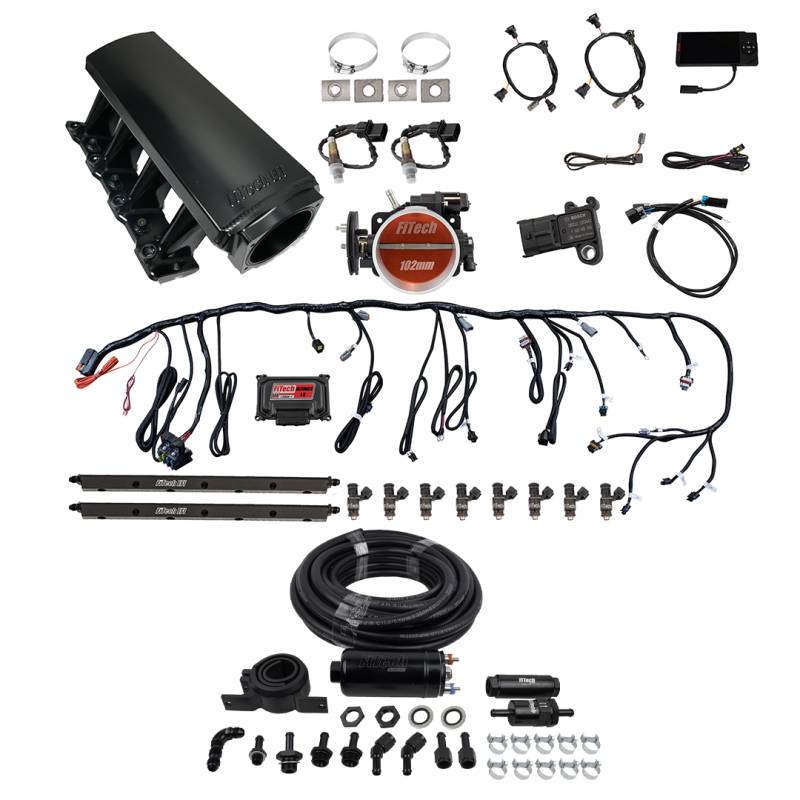 Ultimate LS 750 HP EFI System LS motors have a great base for power, but what they really need is something wicked to wake them up. FiTech LS EFI 750 HP fuel injection systems have alarming power, exciting style, and will take you and your vehicle to the edge. FiTech fabricated many aluminum parts for these systems, including the low-profile 102mm billet throttle body, high-volume billet fuel rails, and an intake manifold with a 1,500 to 6,500 rpm powerband and 3mm construction.Sequential spark and fuel control mate the 55 lbs./hr. injectors, plug-and-play wiring harness, and color touch screen self-learning ECU. This allows you to program two fan control outputs, most tach and speedometer output drivers, and target AFR and timing on-the-fly. A suction cup mounting bracket puts the controller at your fingertips and allows for impressive visual aids.The optional transmission control feature is suitable for 4L60, 4L65, 4L70, or 4L80 GM transmissions. Awaken the beast and feed its needs with an ultra-performing FiTech LS EFI 750 HP fuel injection system with transmission controller. FiTech Ultimate LS EFI Fuel Injection Master Kit'system 750 hp Multi-port Timing Control Compatible Power Adder Compatible