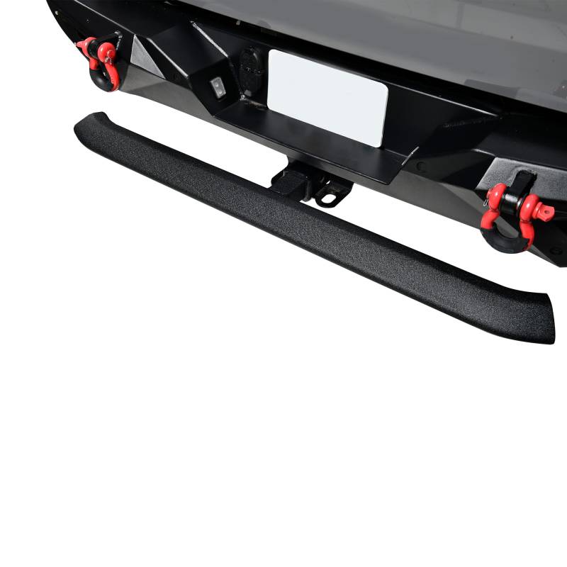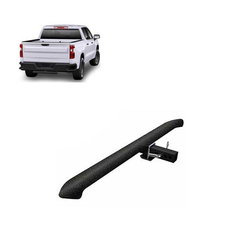 Rear Hitch Step Black Horse Off Road Rear Hitch Step Textured Black Steel 2" Inlet -48" Long Welcome to our 48" long combination hitch-step and bumper guard, one of our Razor series of products Performs 3 functions as a step assist into a pick-up bed, gives easy access to luggage racks on SUVs and helps protect bumpers from rear end damage. Universal fit, mounts to 2" hitch receivers Unique tapered tube 3.5" wide by 2" high at its highest with mandrel bent ends Available in black powder-coated or polished stainless steel