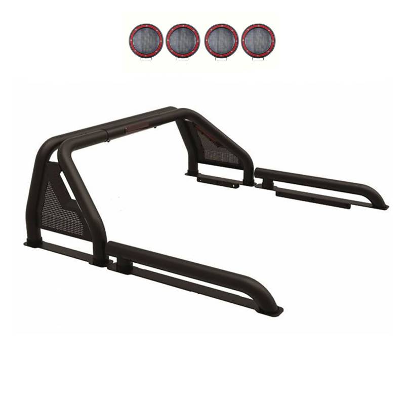 Gladiator Roll Bar Kit Black Horse Off Road Gladiator Roll Bar Kit Black Steel Modular 2 sets of 5.3" Dia. Black LED Flood Lights w/ Harness and Switch Gladiator Roll Bar Kit GLRB-05B-PLFR by Black Horse Off Road - Patent Approved - compatible with 2005-2021 Nissan Frontier Patented Design / Heavy-Duty 3-Inch Diameter 16Ga. Mild Steel Cold-Rolled Tubing Black Powder-Coat Finish / E-Coat Primer for added rust resistance Mandrel bent tube for smooth wrinkle-free OEM quality bends Includes 4x 5.3" Round Auxiliary LED Lights and wiring harnesses and red trim ring
