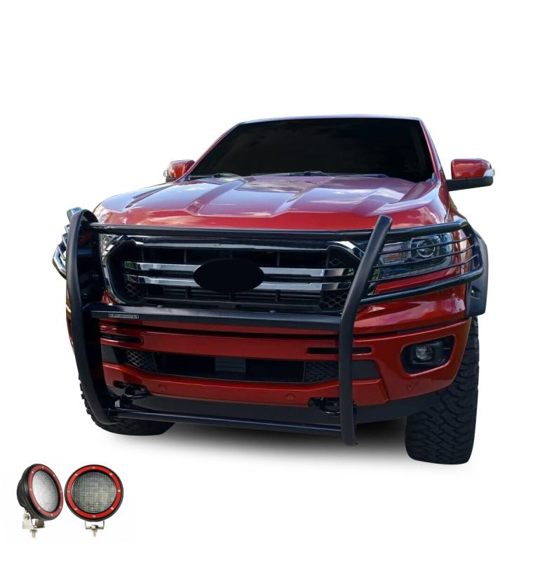 Grille Guard Kit Black Horse Off Road Grille Guard Kit Black Steel Modular Pair of 5.3" Dia. LED Flood Lights w/ Red Trim Rings Wiring Harness and Switch Will interfer with Sensor It May Interfere with Vehicles equipped with Emergency Braking Systems, Adaptive Cruise Control and Parking Sensors Black Horse Off-Road Modular Design Black Powder Coat Grille Guard Kit 17FP10MA-PLFR Compatible with 2019-2023 Ford Ranger No-Drill/ Vehicle-Specific Application for Custom Fit Solid frame-mounted bolt-on, no drill installation / Welded 3-piece bolt-together construction 1/4" thick HRPO vertical steel plates