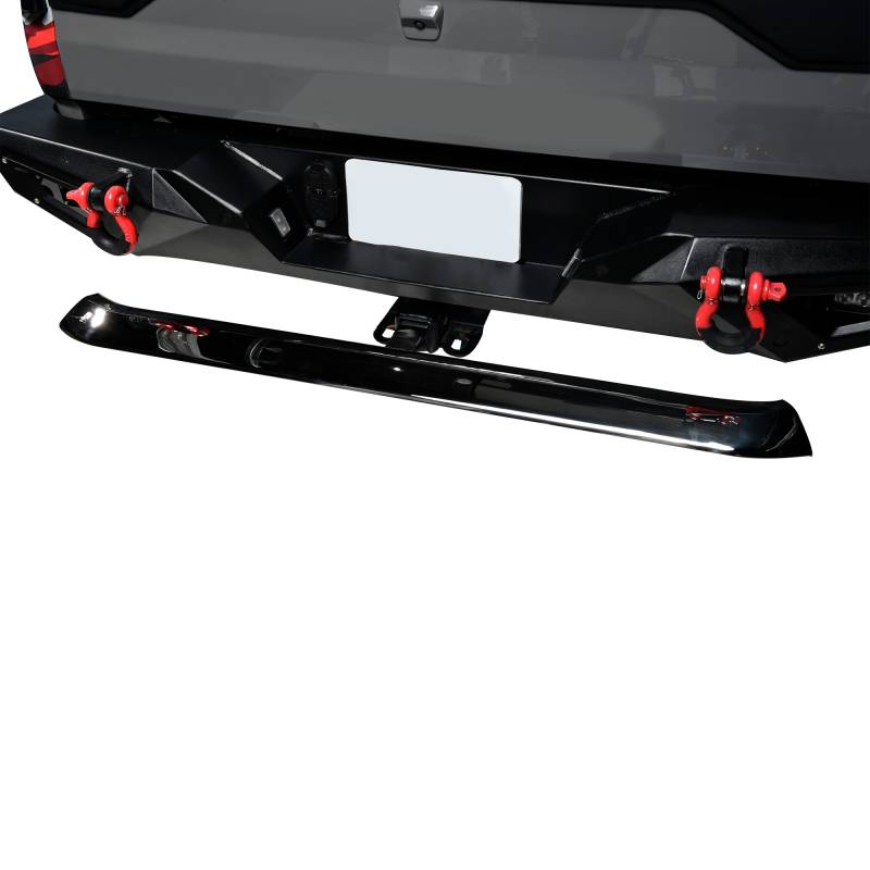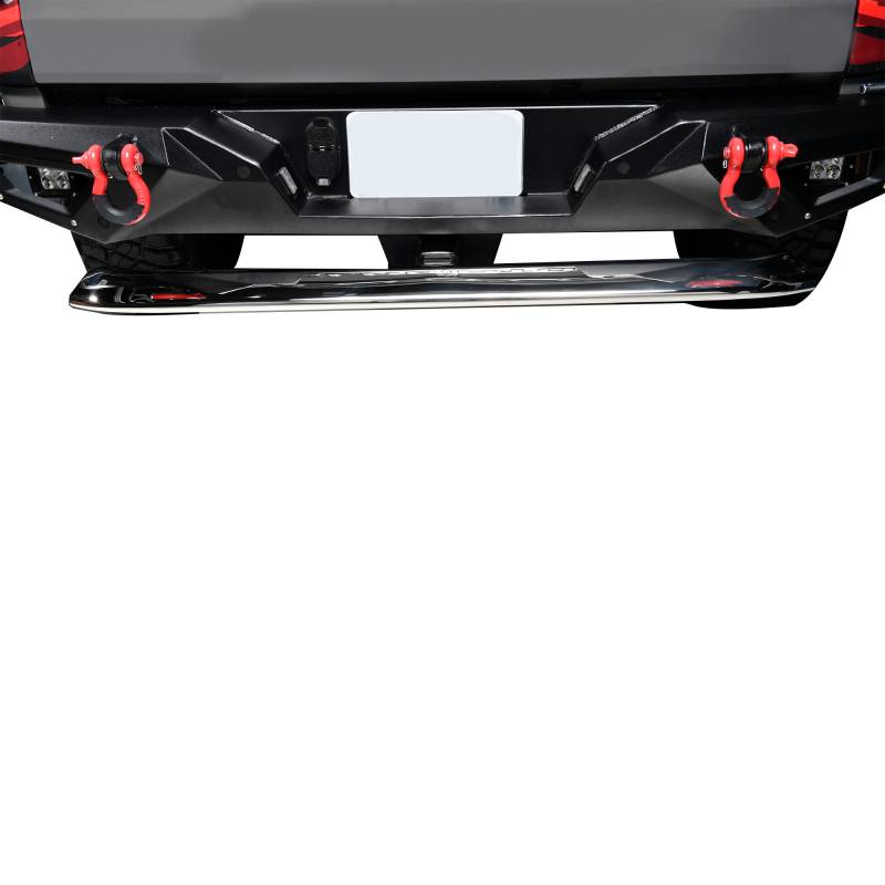 Rear Hitch Step Black Horse Off Road Rear Hitch Step Stainless Steel Stainless Steel 2" Inlet -48" Long Welcome to our 48" long combination hitch-step and bumper guard, one of our Razor series of products Performs 3 functions as a step assist into a pick-up bed, gives easy access to luggage racks on SUVs and helps protect bumpers from rear end damage. Universal fit, mounts to 2" hitch receivers Unique tapered tube 3.5" wide by 2" high at its highest with mandrel bent ends Available in black powder-coated or polished stainless steel