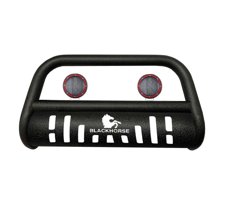 Bull Bar-T Kit Black Horse Off Road Bull Bar-T Kit Textured Black Steel Pair of 5.3" Dia. LED Flood Lights w/ Red Trim Rings Wiring Harness and Switch Black Powder Coated Textured Bull Bar Kit with Skid Plate CBT-A172SP-PLFR by Black Horse Off Road compatible with 2014-2020 Nissan Rogue Textured Finish No-Drill/ Vehicle-Specific Application for Custom Fit Solid frame-mounted bolt-on 16ga. cold-rolled, mandrel-bent mild steel tubing
