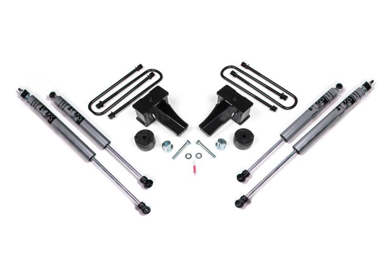 The Super Duty comes from the factory with the front end raked down lower 1-2 Inch. In addition to the 2 Inch leveling kit option offered, Zone Offroad also offers a complete 2 Inch lift kit that combines the 2 Inch front leveling spacers with a replacement rear 4 Inch lift block for a level to slightly tail high stance.
