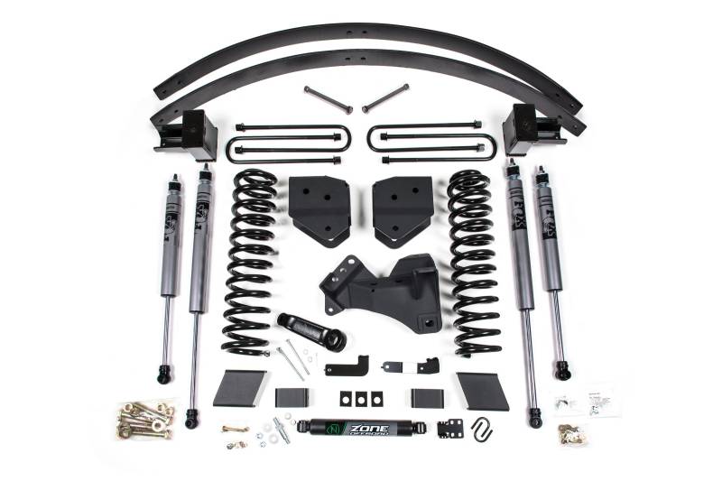 Take your Super Duty to new heights with this 6 Inch lift kit from Zone Offroad. Kits include everything needed to reliably lift your truck and the capability to run up to 37 Inch tires, including coil springs, radius arm drop brackets, steering correction and rear lift blocks or optional add-a-leafs to get the stance and performance you want.