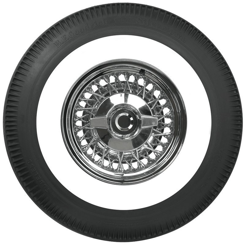 BFGoodrich 950 - 14 2 1/2" WW These beautiful classic BFG whitewall tires have stylish pie crust upper sidewalls and authentic tread designs. These tires are constructed as genuine whitewalls from the first step for a high quality finished product. BFGoodrich Bias Ply pie crust wide whitewall tires are also available with narrow whitewalls for later model classics. BFGoodrich Classic Tires line offers original fitments and custom sizes for hot rods, classic trucks and more. Bias ply tire construction method was used from the 1900's through the 1970's on passenger cars and light trucks. Bright white rubber is added directly to the tire sidewall during initial construction of the carcass, resulting in a truly integrated, high-quality product after vulcanization.