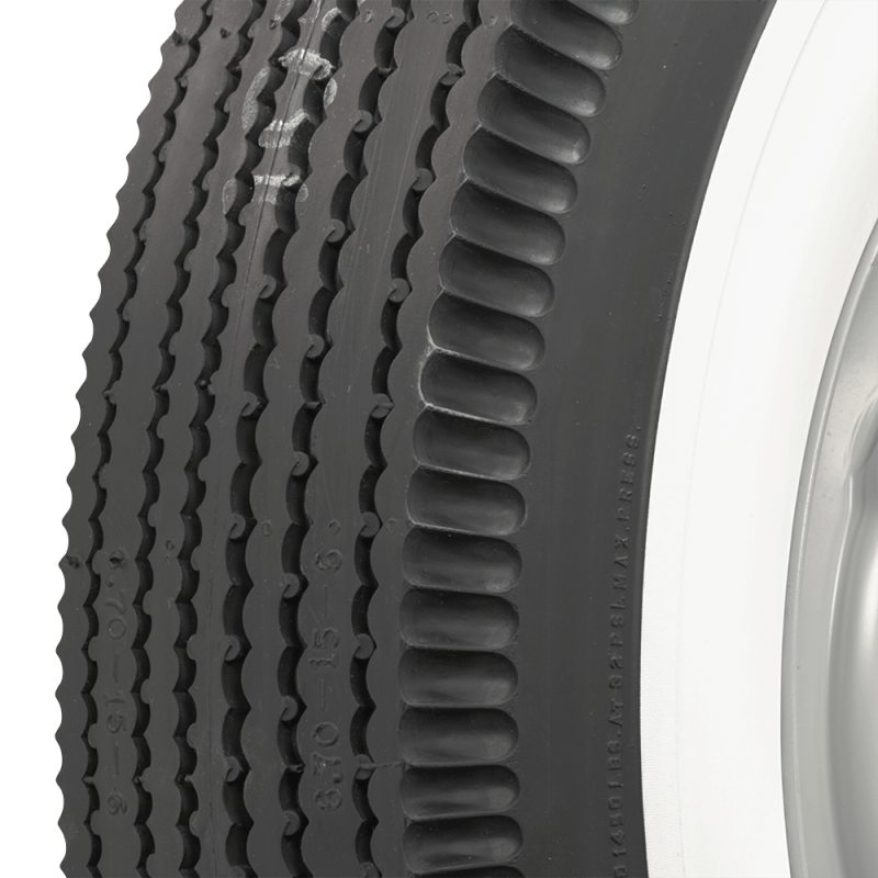 BFGoodrich 670 - 15 3 5/8" WW With genuine wide whitewall construction and period-correct sawtooth tread design, these BFGoodrich tires are the ultimate classic tire for collector vehicles. These tires feature a nice pie crust upper sidewall styling and beautiful wide whitewalls. When shopping for tires for vintage cars, look no further than these authentic BFGoodrich wide whit's. BFGoodrich bias ply wide whitewall tires are made in the USA and DOT/ECE (European Community) approved where applicable. Wide whitewalls are smooth, with all stampings and lettering in the the black portion of the sidewall and are covered by our exclusive life of the tread warranty. Please note that dimensions listed tread width, section width and overall diameter are non-scientific and based on an inflated tire, mounted on a wheel. Dimensions may vary due to rim width and inflation pressure. Tread patterns and sidewall styles vary, please click on individual tires below to view photos. BFGoodrich Classic Tires line offers original fitments and custom sizes for hot rods, classic trucks and more. Bias ply tire construction method was used from the 1900's through the 1970's on passenger cars and light trucks. Bright white rubber is added directly to the tire sidewall during initial construction of the carcass, resulting in a truly integrated, high-quality product after vulcanization.