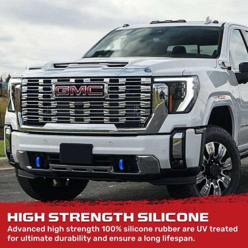 Upgrade the look of your 2020-2025 GMC Sierra 1500's factory tow hooks with our new high strength tow hook covers engineered from 100% silicone rubber available in multiple colors in both standard (Non-LED) and LED Lit versions to help customize your truck and stand out from the crowd. RECON GMC Sierra 1500 Tow Hook Covers are IP67 Waterproof rated and UV treated and engineered to wit'stand prolonged sun exposure to prevent fading and degradation, ensuring lasting quality and style.