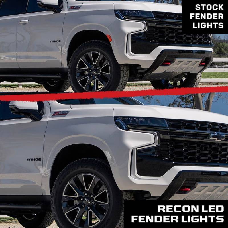 - With amber, red, and white LED fender lights, with either a clear/chrome or black/smoked lens, select the RECON part that finishes off the look of your truck. You're building a masterpiece. A truck with aftermarket accessories that is sure to turn heads, draw attention at the local truck meet ups, and perform both on and off the road. You select only the best parts, and put your time and sweat into installation because you want a truck unlike any other. We get it. At RECON, we're truck lovers too and we share that same goal.