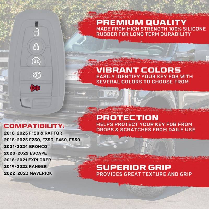 Give your 2018-2025 Ford F150, Raptor or Super Duty (F250, F350, F450, F550) smart key fob a unique look while keeping it safe with RECON's premium quality, 100% silicone rubber smart key fob covers. Available in multiple vibrant colors, these covers not only help you spot your key fob quickly but also provide a superior grip that makes handling your remote easier. Designed for durability, RECON key fob covers are weather-resistant, protecting against scratches, drops, and dings from daily use. Glow in the dark buttons provide night time visibility, making your key fob easy to find and use in the dark. Easy installation and precise cutouts for all buttons and sensors, these covers offer a custom look and all-around protection in one sleek design.