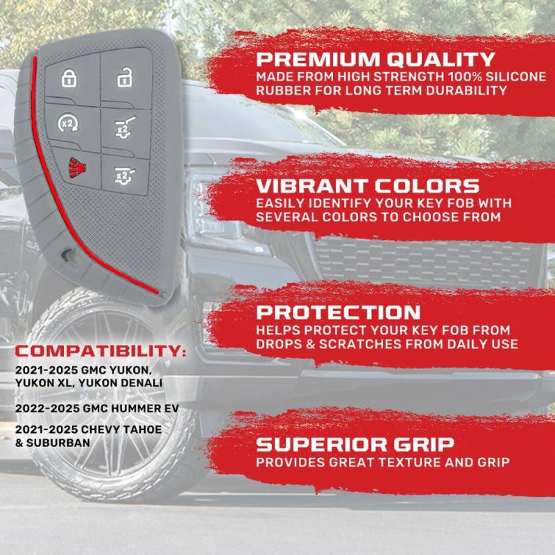 Give your 2021-2025 GMC Yukon, Yukon XL, Yukon Denali (5th Gen), 2022-2025 GMC Hummer EV, or Chevy 2021-2025 Tahoe/Suburban (5th Gen) key fob a unique look while keeping it safe with RECON's premium quality, 100% silicone rubber key fob covers. Available in multiple vibrant colors, these covers not only help you spot your key fob quickly but also provide a superior grip that makes handling your remote easier. Designed for durability, RECON key fob covers are weather-resistant, protecting against scratches, drops, and dings from daily use. Glow in the dark buttons provide night time visibility, making your key fob easy to find and use in the dark. Easy installation and precise cutouts for all buttons and sensors, these covers offer a custom look and all-around protection in one sleek design.