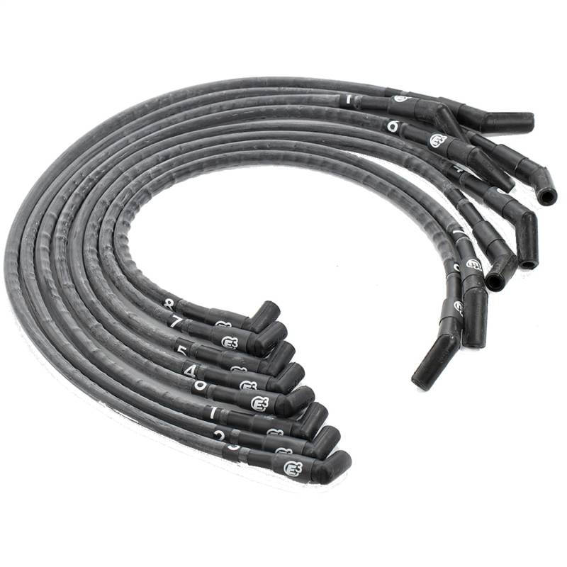 The E3 racing spark plug wire sets are designed to maximize the power of E3 Spark Plugs DiamondFIRE Technology. Sporting a Class F40 Spiral Conductor an 8.5mm configuration with rating of 40 Ohms per foot, the silicone outer jacket encases a silicone inner jacket with stainless steel terminals. Available in both universal and engine specific as well as sleeved or unsleeved configurations, E3 DiamondFIRE Racing Spark Plug Wire Sets offer the highest silicone content rating of any competitive racing wire today, giving you maximum heat protection and maximum performance.