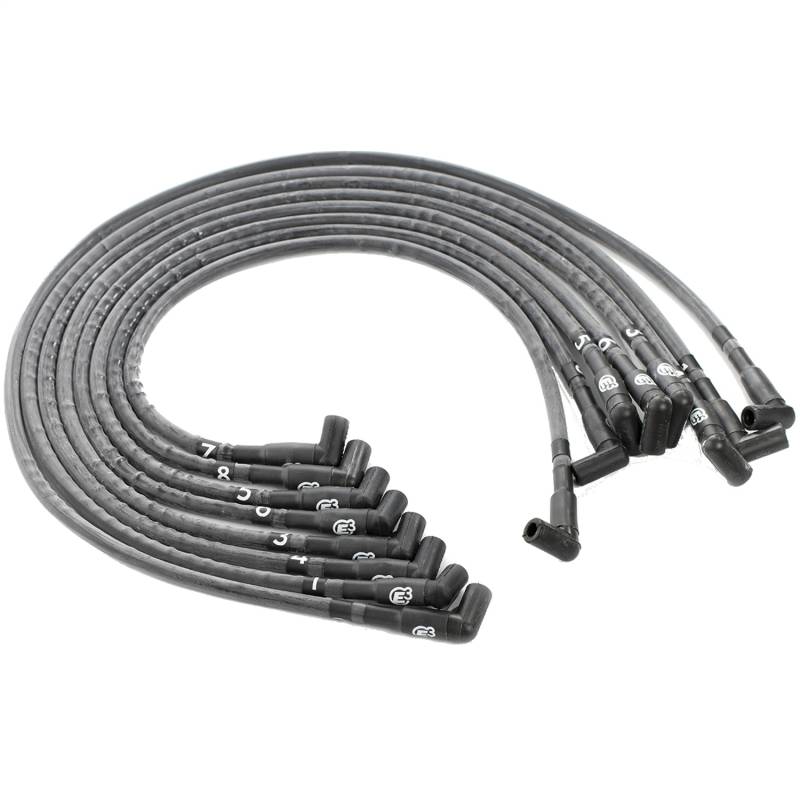 The E3 racing spark plug wire sets are designed to maximize the power of E3 Spark Plugs DiamondFIRE Technology. Sporting a Class F40 Spiral Conductor an 8.5mm configuration with rating of 40 Ohms per foot, the silicone outer jacket encases a silicone inner jacket with stainless steel terminals. Available in both universal and engine specific as well as sleeved or unsleeved configurations, E3 DiamondFIRE Racing Spark Plug Wire Sets offer the highest silicone content rating of any competitive racing wire today, giving you maximum heat protection and maximum performance.