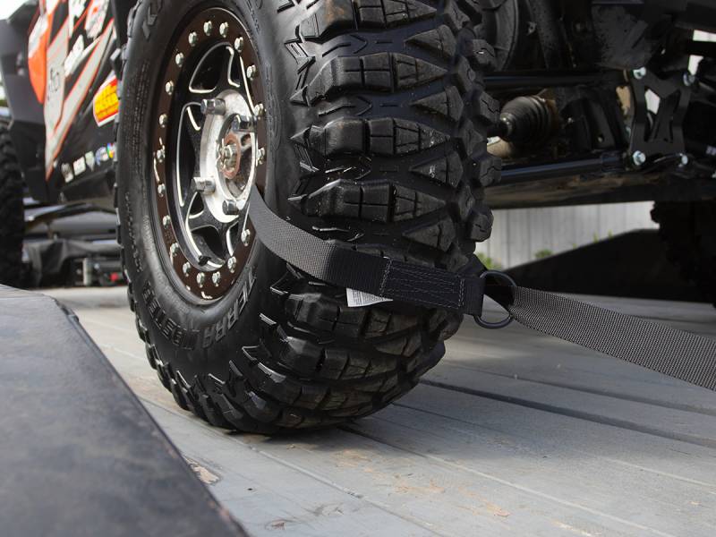 These straps are another great way to lock the wheels down to the trailer. Simply take the strap end of the tie-down and run it through the wheel, then feed it through the D-Ring, and then back into the ratchet barrel. Pull tight and ratchet the tire down tight to your trailer.