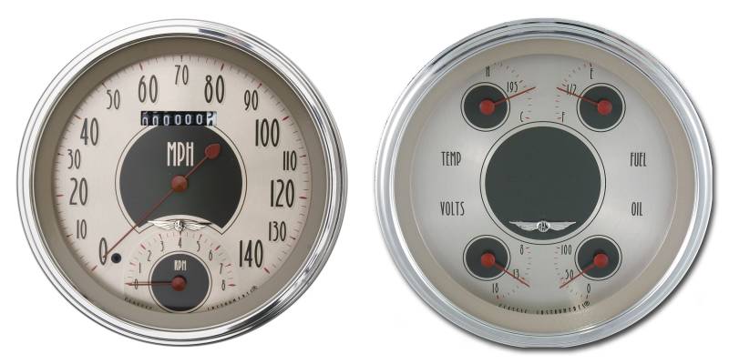 1947-53 All American Nickel Truck Package;features;a 4 5/8" Speedtachular;(Speedo/Tach combination gauge) and Quad (Fuel, Oil, Temp,; Volt combination gauge) with stainless low step bezels and flat glass lenses. This package is also available with our 4 5/8” standard speedometer in place of the Speedtachular.