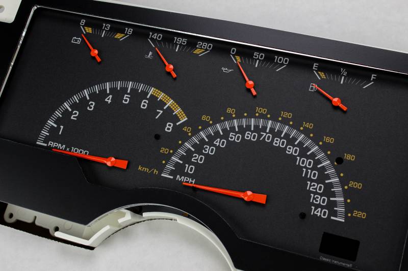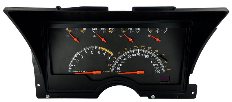 The kit also includes: a wiring harness, push-button calibration for ease of setup, and built-in ECM signal filter switch to remove signal noise for smoother speedometer operation. Save space with Classic Instruments' Zeus Speedometer Technology built-in, meaning the cluster requires no external control boxes and works directly with ECM or VSS signals. The fuel gauge is programmable for many ohm ranges with a selector switch on the back of the cluster, meaning the fuel gauge will work with the stock sending unit, any other factory sending units, or any Classic Instruments fuel sending unit. All other necessary sending units are included in a Classic Instruments GM sending unit kit. Zeus-Link is available for separate purchase for a direct connection to GM and Holley ECUs. Install using customers' existing diffuser and lens. This new '88-'94 OBS Chevy truck cluster from Classic Instruments is proudly made in the USA and can be purchased direct or through any one of its authorized dealers.\nThis new 1988-1994 OBS Chevy truck cluster from Classic Instruments is proudly made in the USA. Zeus speedometer technology, all electric, no external boxes, hybrid lighting, shift light and check engine, single connector, molded housing, made in USA, push button calibration, programmable fuel gauge. SN73Z-GM Zeus Link can be added to any OBS cluster to operate from vehicle can bus.\nClassic Instruments all new 1988 "'94 OBS Chevy Truck direct-fit package. It is an all-electric cluster featuring a speedometer, tachometer, fuel, oil, temp, and volt gauges in an OE style, available either with or without a window to view the gear position indicator. It also features a digital OLED odometer with trip meter and optional digital speed readout. Hybrid LED Lighting offers the feel of the original perimeter lighting and the visual benefits of back-lighting: even illumination and clear nighttime readability. Additional light features include check engine, high beam, shift lights, and integrated LED dimmer.