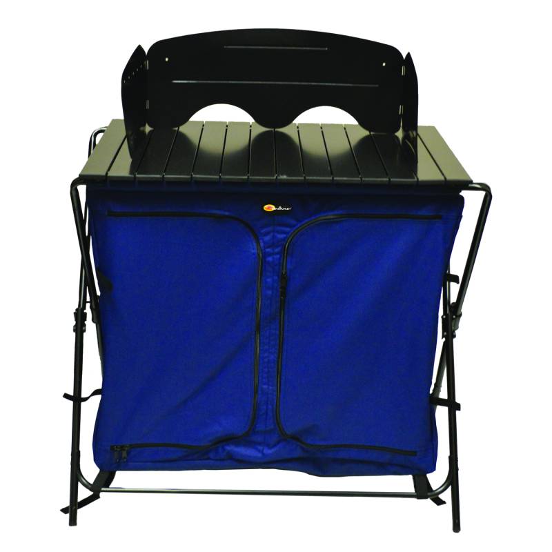 Camp Cuisine Table/ Cupboard The Faulkner Camp Cuisine Kitchen allows you to prepare food wherever you go. Store and work with your kitchen tools in this convenient portable kitchen. Constructed With Sturdy Aluminum Tubing Frame, Aluminum Panel Surface, And 600D Polyester Fabric Store And Utilize Your Kitchen Supplies On-The-Go Top Surface Features A Wind Deflector To Protect Your Camp Stove 3 Storage Shelves Which Can Hold Up To 20 Pound Zipper Doors Allow You To Secure Your Shelved Supplies And Keep Bugs And Dirt Out