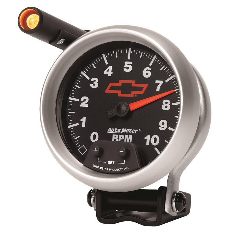 GAGE, TACH, 3 3/4", 10K RPM, PED W/ EXT. QUICK-LITE, CHEVY RED BOWTIE, BLACK Since 1957, Autometer Has Set The Standard In Performance, Accuracy And Durability With Their Legendary Tachometers. The Absolute Pinnacle Of Engineering And Technology, Its No Wonder Autometer Can Lay Claim To More Motorsports Victories Than Every Other Gauge Manufacturer Combined. The Patented Air Core Meter Movement, Wound In House To Exacting Standards, Can Move The Needle From 0 - 10,000 Rpm In 333 Milliseconds. An Ultra Bright Led Shift Light Guarantees You Hit Your Shifts Perfectly, Every Time. An Inaugural Inductee To The Hot Rod Speed Parts Hall Of Fame, No Other Tachometer On The Market Has Had Anything Approaching Its Impact On Professional Racing. Built For A Lifetime Of Service Under The Harshest Conditions, This Is The No Compromise Tach For No Compromise Builds. When You" Re Ready For The Best, There Isnt Another Choice. Modern LED through-the-dial lighting provides clear visibility during nighttime use Compatible with 0.5 - 6 pulse ignition signals (1-12 cylinder engines) with points, electronic, and most 12V high-performance racing ignitions. Autometers Race Proven Air-Core Electric Tachometers Provide Quick And Accurate Readings With A Needle So Responsive It Can Go From 0 - Full Scale In 333 Milliseconds 12 and 16 volt compatible, well-suited with nearly every street car or race car electrical system Optimize Use Of Your Engines Power Band And Improve Vehicle Run Performance And Driver Gear Changes With A Rapid Response, High Visibility User-Programmable Shift Light.